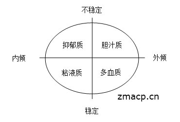 把人区分为多血质、胆汁质、粘液质和抑郁质四种传统的气质类型,是心理学中流行的分类法。但是,在现实生活中,并不是每个人都能完全归于某一气质类型,除了少数人具有四种类型的典型特征外,大多数人均属于中间型或混合型,即较多的具有某一类型的特点,同时又具有其他类型的一些特点。
